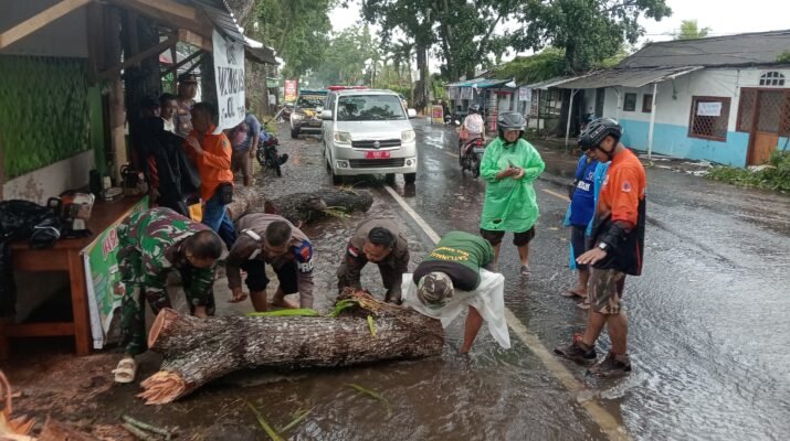 Gambiran – Cuaca ekstrem berupa angin kencang yang melanda wilayah Kecamatan Gambiran pada Sabtu (14/03/2026) mengakibatkan sebuah pohon besar tumbang dan melintang di jalan