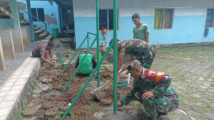 Gambiran – Personel Koramil 06 Gambiran Kodim 0825 Banyuwangi menunjukkan kepedulian nyata terhadap kebugaran generasi muda melalui aksi pembangunan fasilitas olahraga di Pondok Pesantren