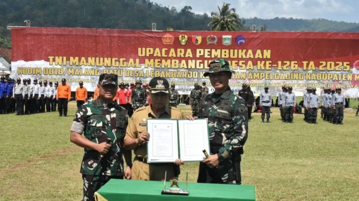 Malang – Komandan Kodim 0818/Malang-Batu Letkol Czi Bayu Nugroho secara resmi menandatangani Naskah Kerja Sama Program TNI Manunggal Membangun Desa (TMMD) ke-126 Tahun 2025 bersama Bupati Malang H. M. Sanusi. Penandatanganan ini berlangsung di Lapangan Desa Lebakharjo, Kecamatan Ampelgading, Kabupaten Malang, Rabu (8/10/2025), bertepatan dengan pembukaan resmi kegiatan TMMD ke-126.