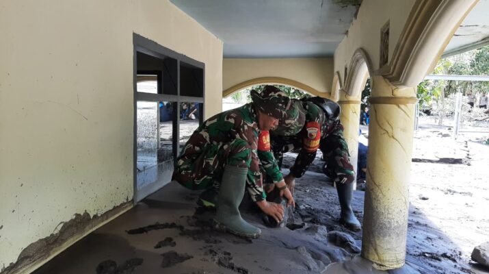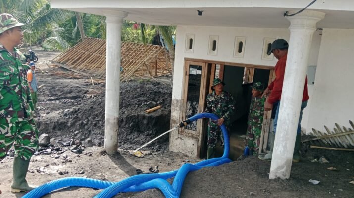 Lumajang — Babinsa Pagowan Koramil 0821-17/Pasrujambe, Serda Samsul Husen bersama anggota lainnya, melaksanakan pembersihan rumah warga yang terdampak lahar dingin dengan metode penggelontoran menggunakan
