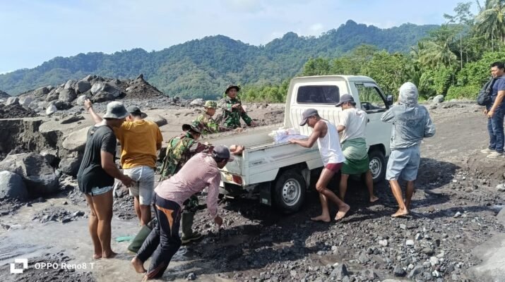 Lumajang — Sejumlah anggota Kodim 0821/Lumajang yang dipimpin oleh Peltu Danang Widiatmoko Bati Tuud Koramil 0821/14 Pronojiwo turut membantu warga mendorong sebuah mobil pick