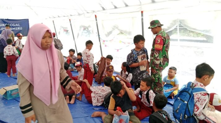 Lumajang — Upaya memulihkan sektor pendidikan pasca erupsi Gunung Semeru di Kecamatan Pronojiwo terus digencarkan. Kodim 0821/Lumajang kembali menunjukkan komitmennya dengan mengerahkan para Babinsa