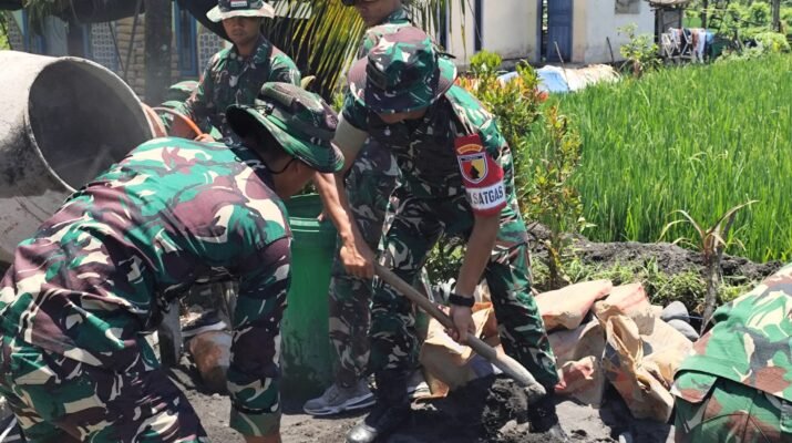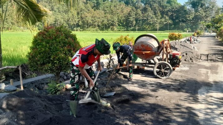 Anggota Satuan Tugas (Satgas) TNI Manunggal Membangun Desa (TMMD) ke-126 Kodim 0818/Malang-Batu, khususnya dari Yonzipur 5/Abw, saat mereka bersama-sama masyarakat Dusun Kerajan 1A, Desa