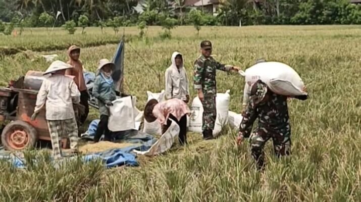 Ampeldaging — Sejumlah anggota Satuan Tugas (Satgas) TNI Manunggal Membangun Desa (TMMD) ke-126 terlihat menyatu dengan warga, bahu-membahu membantu proses dores padi (perontokan padi)